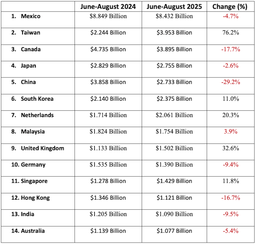 Fourteen foreign markets recorded one billion dollars or more in imports from California in this year’s June-August period. Remarkably but unsurprisingly, shipments to China and Hong Kong continued their precipitous declines as both Japan and Taiwan claimed larger shares of California’s transpacific export trade.