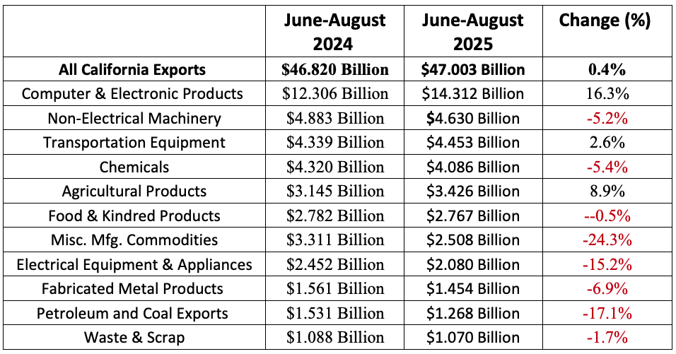 Due to the recent Federal government shutdown, the California Trade Report has been updated with August data only. The most recent data available, September, has not been released. We will update this report as soon as that data becomes available from the U.S. Census Bureau.